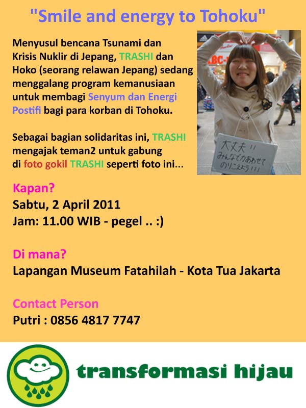 Kampanye kemanusiaan ini disebut sebagai Smile and Energy to Tohoku. TRASHI mengajak warga Jakarta, pengunjung Museum Fatahilah dan siapapun yang tergerak untuk melakukan Donasi Semangat dan Energi Positif bagi para korban di Tohoku.