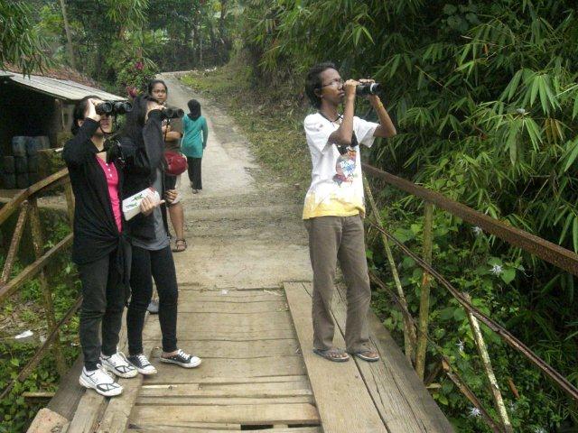 Agenda pertama hari itu adalah Bird Watching (pengamatan burung). Yap!! ini adalah kegiatan favoritku. Jembatan adalah spot pertama yang kami kunjungi untuk mencari burung untuk kami amati.(FYI ada insiden di sini, turut berduka atas terjunnya HP Hanan Nabilah di Sungai Ciliwung). Sedikit sulit memang untuk mengamati burung di tempat seperti ini. Bambu dan pepohonannya yang sangat rimbun mengharuskan aku dan yang lain untuk semakin teliti. Dan akhirnya setelah sekian lama, kami berhasil mengidentifikasi sekitar kurang lebih 7 spesies burung. Salah satu yang membuatku gembira adalah aku dapat menemukan spesies Cekakak Jawa (Javan Kingfisher/Halcyon cyanoventris) untuk pertama kalinya.