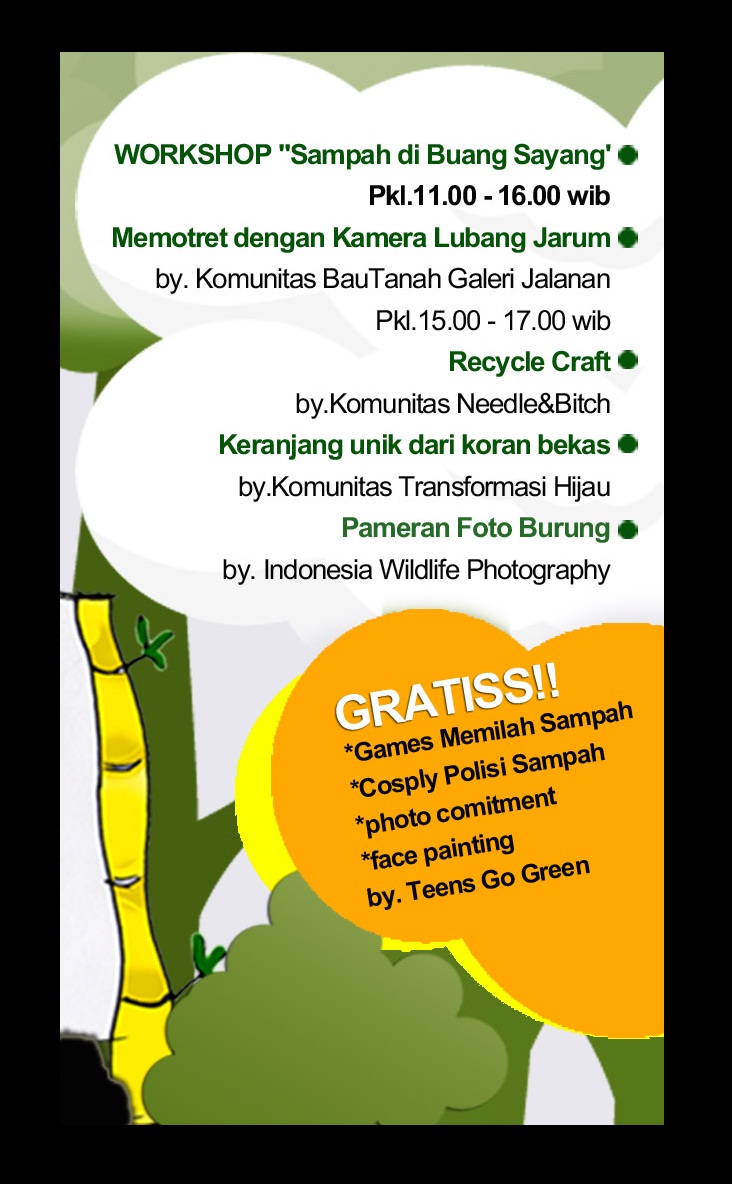 Kegiatan ini kerjasama RumahPohon Activity dengan Transformasi Hijau, Teens Go Green, Indonesia Wildlife Photography, BauTanah Galeri Jalanan, Needle&Bitch, dan Komunitas Ciliwung